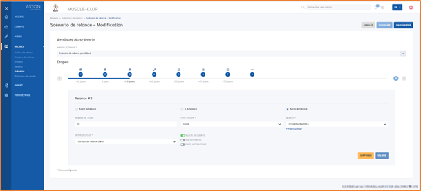 Ces scénarios de relance peuvent être configurés librement au niveau de la rubrique « Scénario »