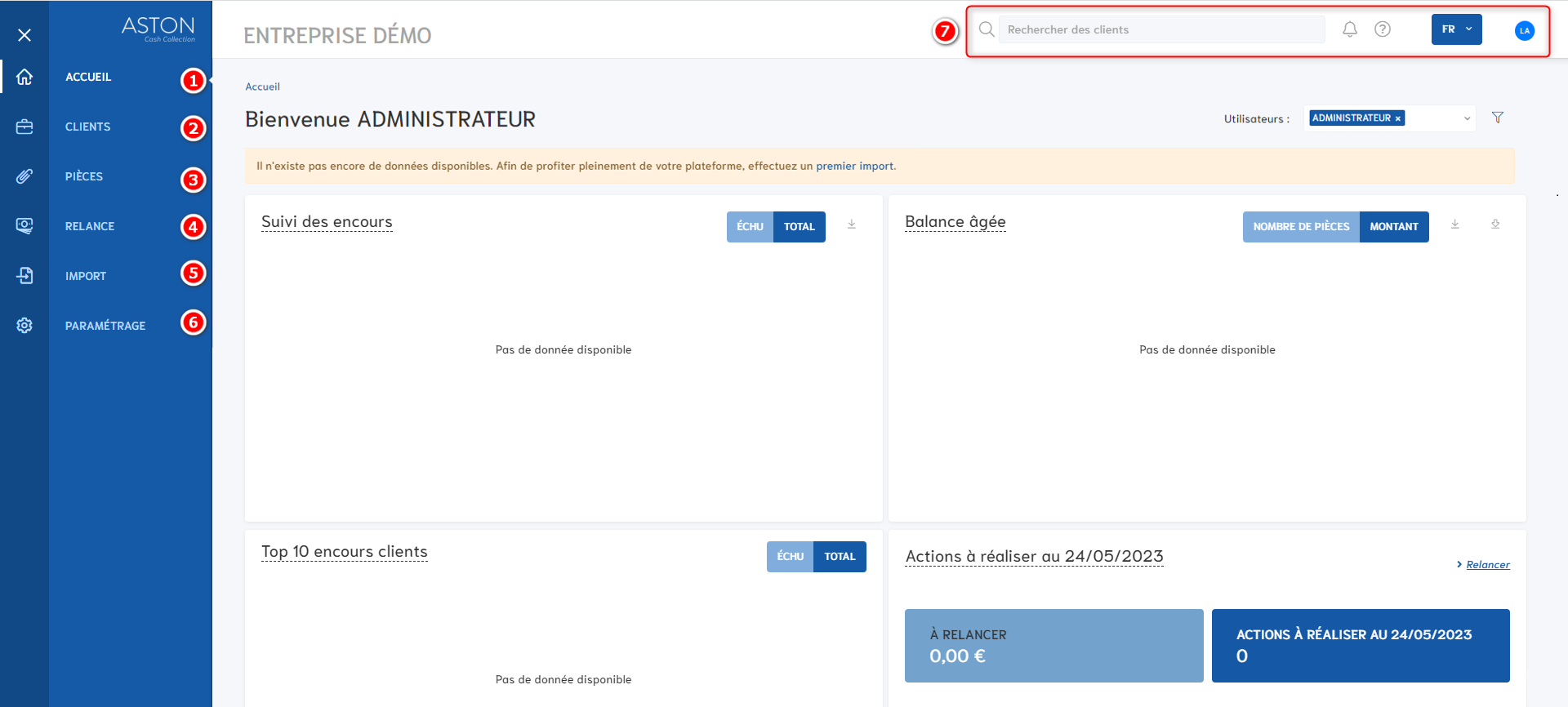 Si la page d’accueil ne présente aucune information lors de votre première connexion, un premier import de données sera nécessaire pour alimenter les différents modules de votre plateforme. Merci de vous rapprocher de notre équipe support pour mettre en place l’import de données qui vous correspond.